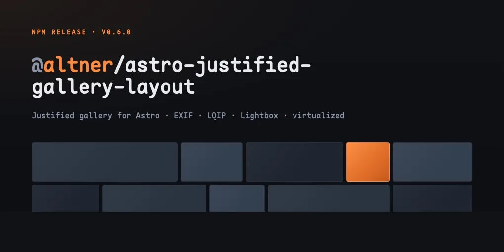Mein neues npm-Paket @altner/astro-justified-gallery-layout: eine schlanke Justified-Gallery für Astro mit EXIF/IPTC/GPS, LQIP-Previews, virtualisierter Variante für riesige Sammlungen und einer eingebauten Lightbox.